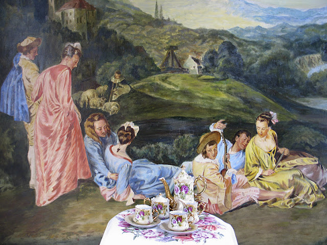 This painting of a gallant party is a copy of the original Watteau painting out of the Palace Berlin-Charlottenburg. Since centuries they sit there in the park, play music and never had a tea. Can you see how they look yearning for the tea cups? I will serve those elegant party their first tea ever.